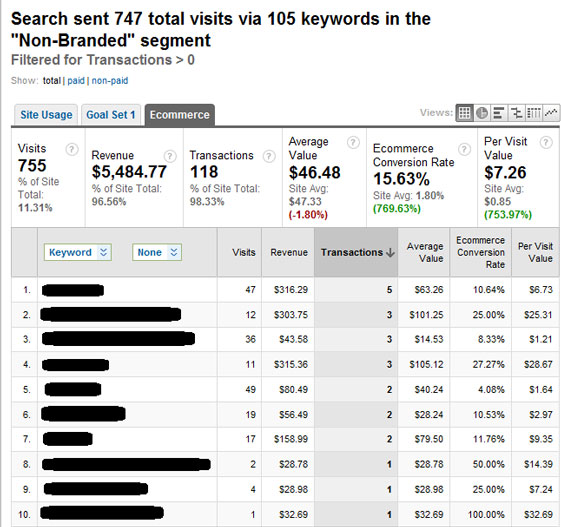 We now turn our attention to e-commerce. Since our goal is to get the most “bang for our buck,” we need to find those keywords which convert. I chose to use a simple advanced filter where, based upon the number of transactions and traffic that this client has received, I set the number of transactions to greater than zero and then sorted by descending by the number of transactions.
